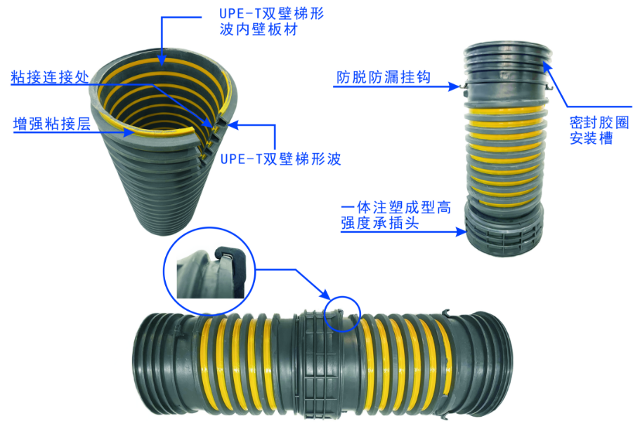 獨(dú)特的生產(chǎn)工藝和產(chǎn)品設(shè)計(jì)突出了UPE-T雙壁增強(qiáng)纏繞管的產(chǎn)品優(yōu)勢。